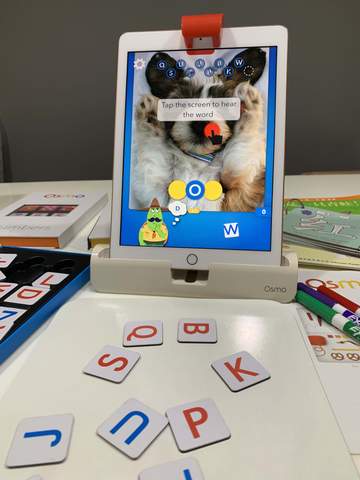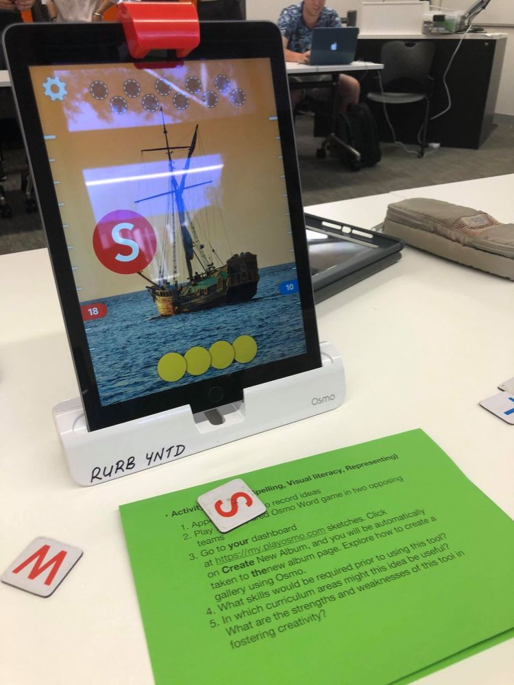 Osmo is a digital tool for iPad that combines images and sounds with tactile tools such as letter tiles. Using a stand and mirror placed over the camera, Osmo can recognise objects placed in front of the screen enabling student’s real-life experiences to overlap into the digital space. The game we played required us to place letter tiles in front of the screen in order to spell out a word associated with an image displayed on the screen. Letters were either correct and placed into the corresponding space in a word or were incorrect and resulted in the loss of a chance, similar to the classroom classic “hangman”.